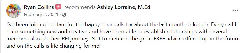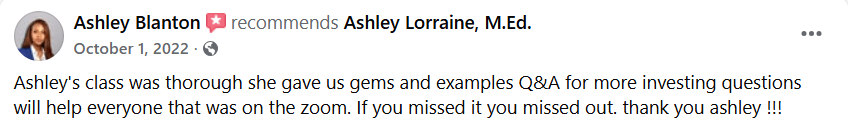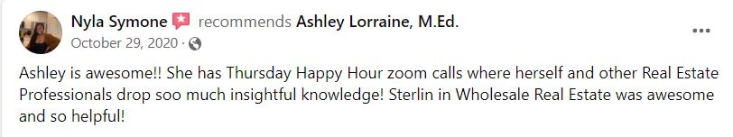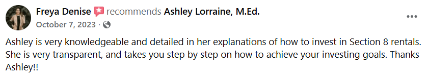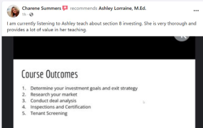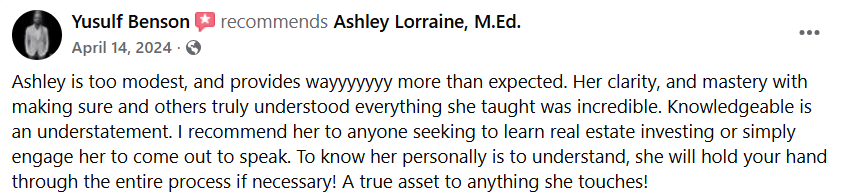 "I worked with Professor Ashley on a home renovation TV show. Behind the scenes, she told me how she acquired the properties Subject-To the existing loans. I signed up for her course and during my training I purchased a duplex by taking over the mortgage. I planned to fix and flip it until Professor Ashley's course taught me the value of rsidual income. I turned those doors into rental properties. This course, this Professor has changed my life...and my networth!